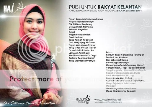 Sajak yang dideklamasikan oleh artis Indonesia, Meyda Sefira (Pelakon Ketika Cinta Bertasbih) dalam program Bicara Selebriti sempena Hari Hiburan Islam Kelantan yang telah diadakan pada 1 Disember 2012 bertempat di Stadium Sultan Muhammad ke-IV dan dihadiri oleh kira-kira 20 000 hadirin.