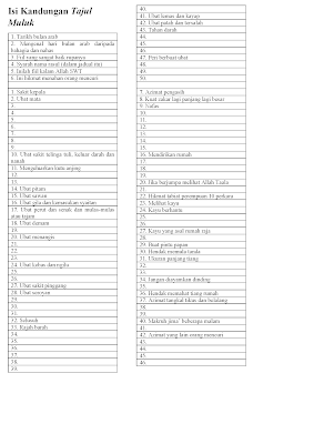 Isi kandungan kitab Tajul Muluk. Ada beberapa tajuk atau bab yang saya tak dapat tuliskan di sini kerana tidak kefasihan saya membaca jawi.